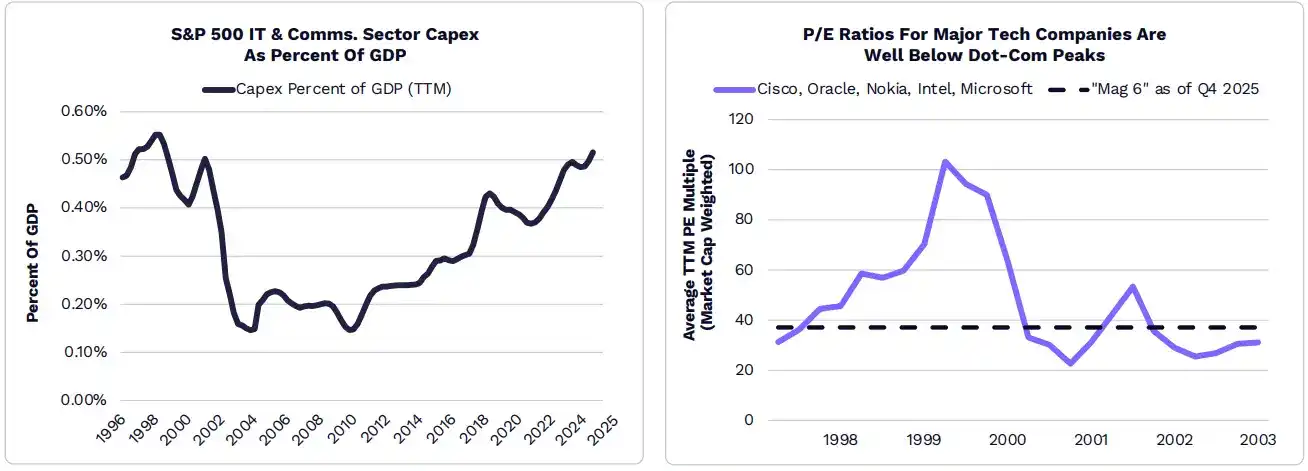 根据 ARK 研究,超大规模数据中心运营商在 2026 年的资本支出将超 5000 亿美元,几乎是 2021 年 1350 亿美元的三倍(即 2022 年 ChatGPT 热潮之前)。尽管信息技术和通信服务行业的资本支出占 GDP 的比例已达到 1998 年以来的最高水平,但科技行业的市盈率(P/E)却远低于科技与电信泡沫时期的峰值。