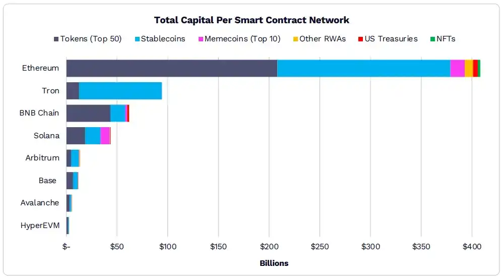 · 以太坊上的资产总值现已超 4000 亿美元。在八大最热门的区块链中,有七条链的 90% 市值由中稳定币和排名前 50 的代币支撑。