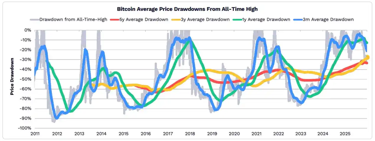 2025 年,比特币价格相对于其历史最高点的平均跌幅有所平缓。