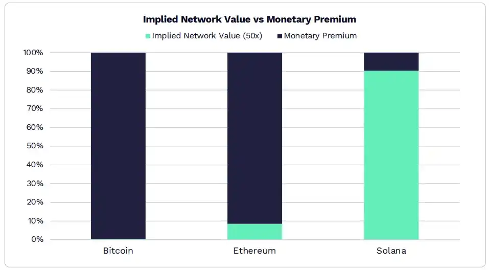 L1 网络正从创收网络演变为货币资产。如果以基于 50 倍收入倍数推算,以太坊超过 90% 的市值都归功于其作为货币资产的角色。而 Solana 产生了 14 亿美元的收入,证明其估值 90% 来自网络效用。