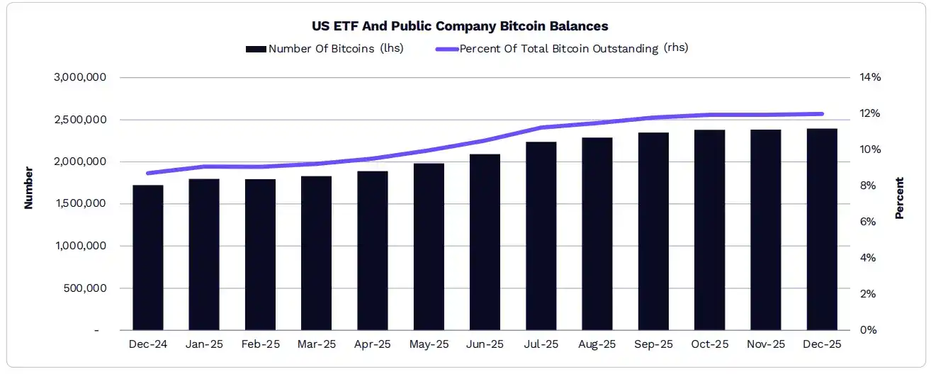 2025 年,比特币 ETF 的持有量增长 19.7%,从约 112 万枚增至约 129 万枚;而上市公司持有的比特币数量增长了 73%,从约 59.8 万枚增至约 109 万枚。因此,由 ETF 和上市公司持有的比特币总量占比从 8.7% 上升至 12%。