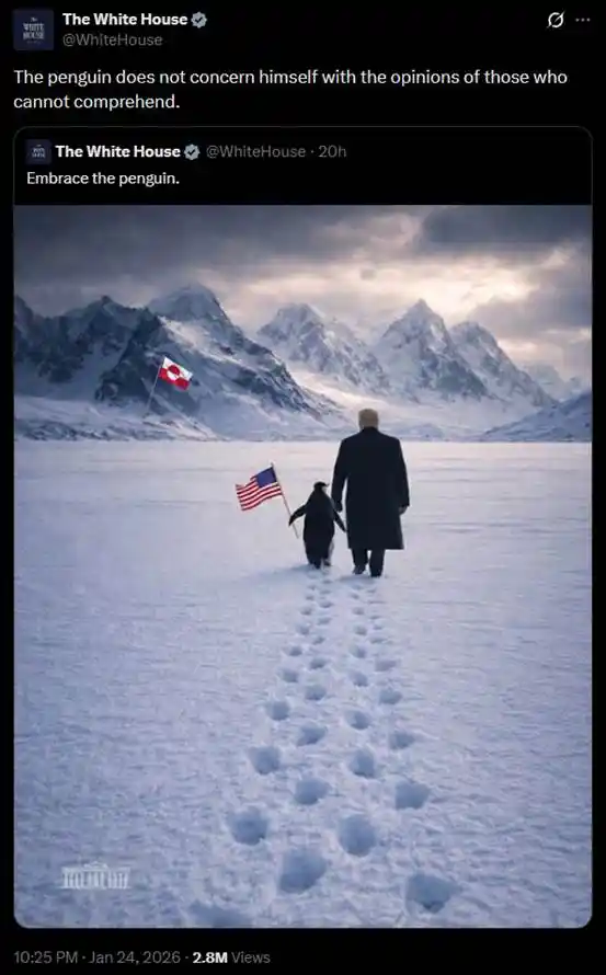 同一天的晚间 10 点半,白宫 X 账号再次引用该推文,并配上文字,「这只企鹅从不在意那些不理解它的人的看法」。