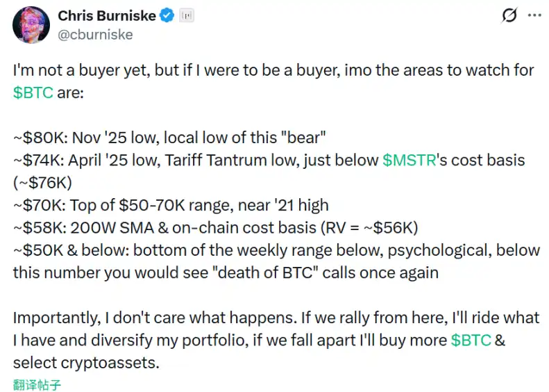 Placeholder 合伙人则发推表示将会重点关注几个买入点位,比如 8 万美元、7.4 万美元以及 7 万美元等,他表示「我不在乎最终结果如何。如果市场从这里反弹,我会继续持有现有仓位并分散投资组合;如果市场崩盘,我会买入更多 BTC 等加密资产。」