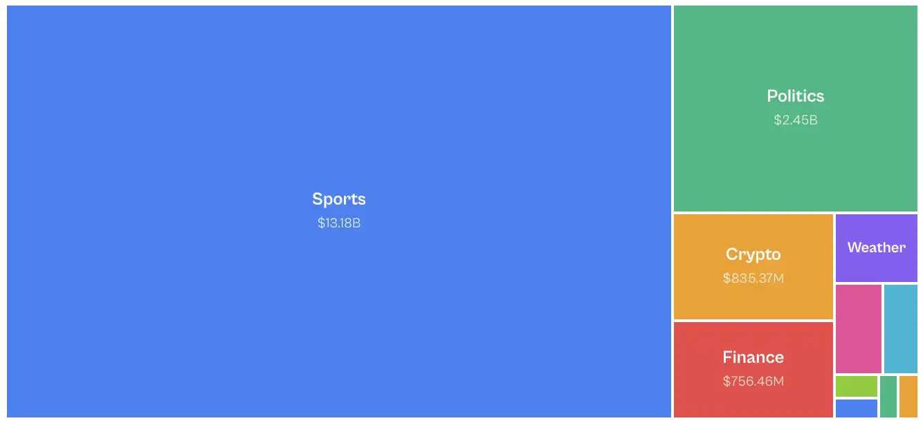 Kalshi 于 2021 年推出,是美国首个受 CFTC 监管的预测市场。该平台最初专注于经济和天气数据,直到 2024 年以前一直处于小众地位。在法律上战胜 CFTC 并获得上市政治合约的权利后,2024 年的选举周期引发了爆发式增长。2025 年引入的体育市场目前主导了交易活动。各类别的交易量分布极不均衡:体育占名义交易量的 72%,其次是政治(13%)和加密货币(5%)