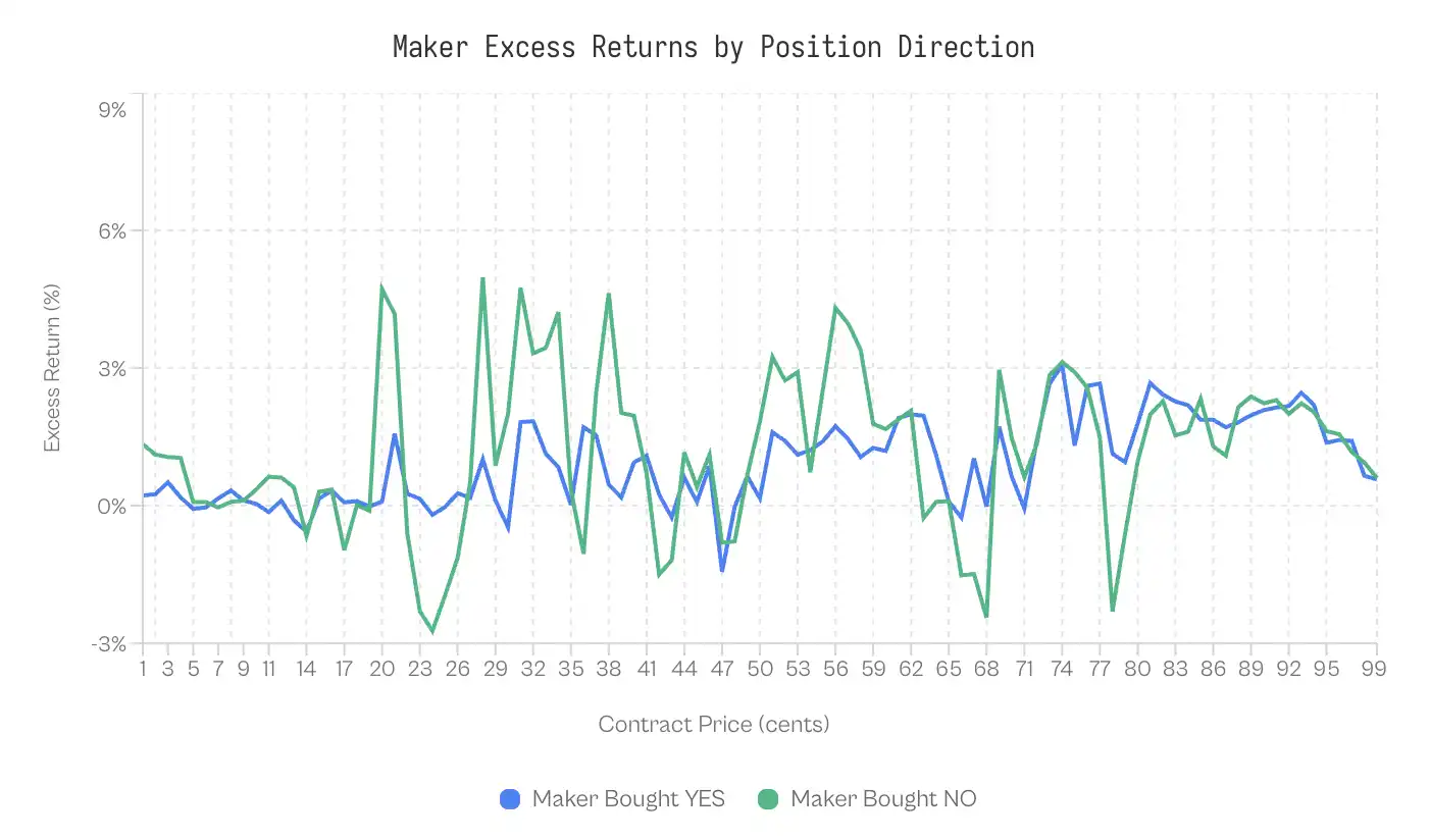 买入 NO 的挂单者在 59% 的时间里 表现优于买入 YES 的挂单者。