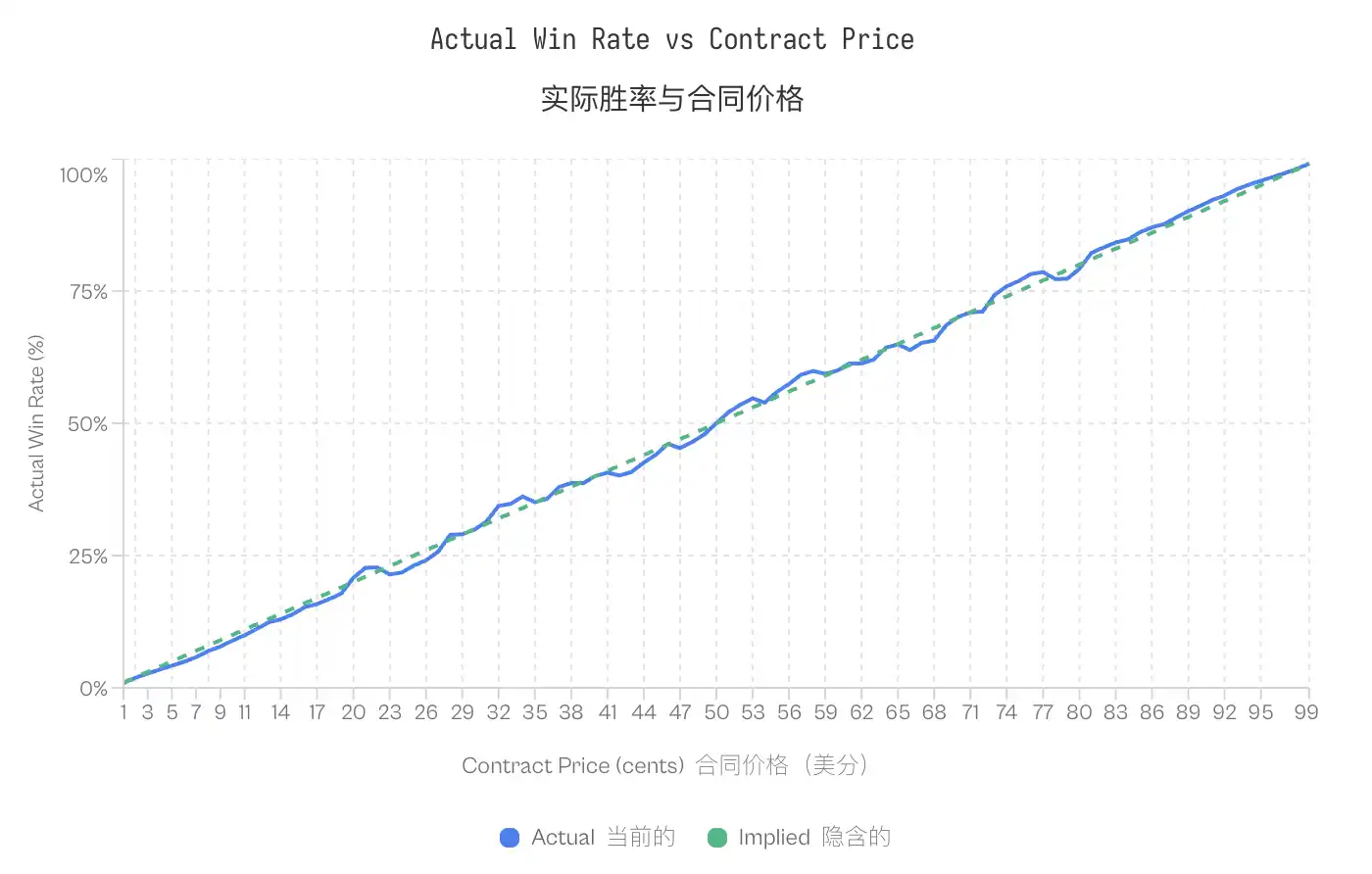 注: 尽管存在这种偏误,校准曲线显示预测市场实际上相当有效和准确,除了尾部(极低或极高价格)略有例外。隐含概率与实际概率的紧密对齐证实了预测市场是校准良好的价格发现机制