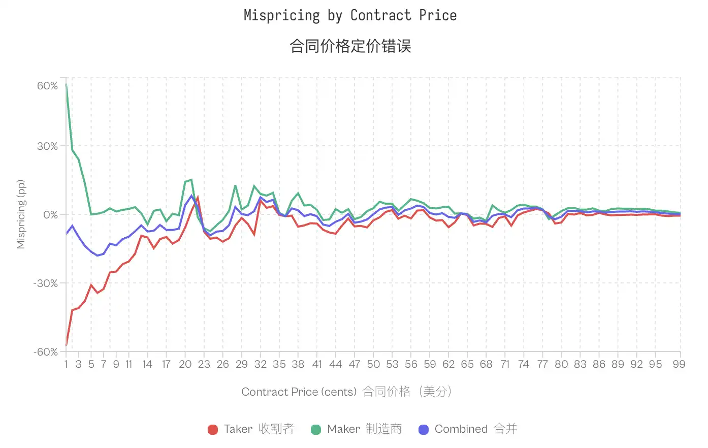 这种分歧在尾部最为明显。对于 1 美分的合约,吃单者的胜率仅为 0.43%(隐含概率为 1%),对应 -57% 的错价。同一合约的挂单者胜率为 1.57%,错价为 +57%。在 50 美分处,错价被压缩;吃单者显示 -2.65%,挂单者显示 +2.66%。在 99 个价格水平中的 80 个,吃单者表现为负超额收益,而挂单者在相同的 80 个水平上表现为正。