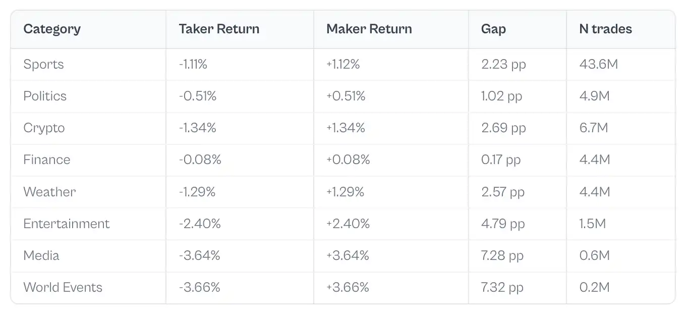 这种统计对称性表明,做市商并不具备显著的预测赢家的能力。相反,他们通过结构性套利获利:为那些偏好高风险、高回报结果的「吃单者」群体提供流动性。