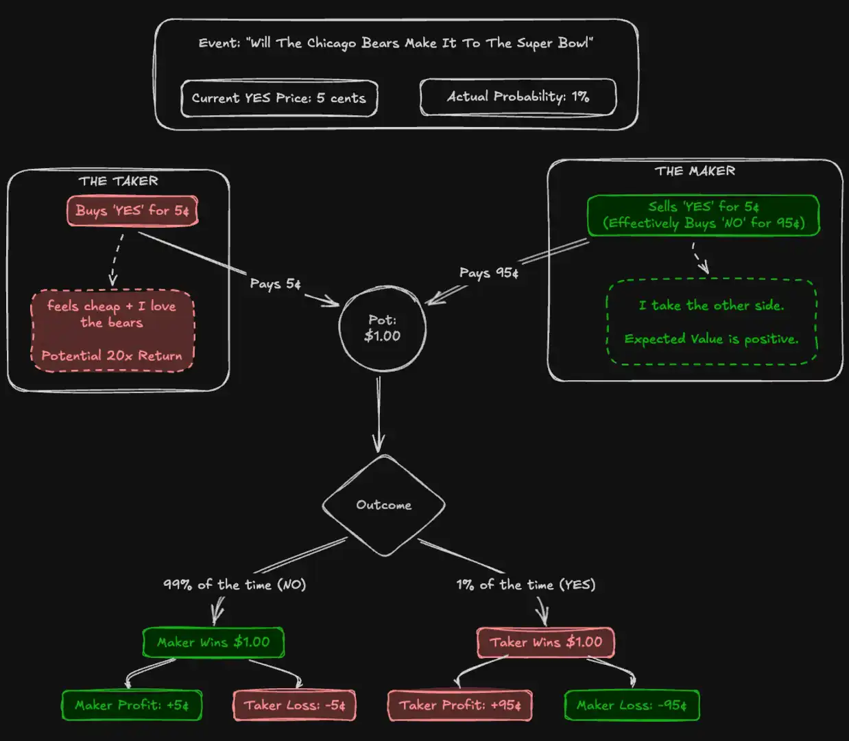 市场分裂为两个截然不同的人群:一个系统性地为低概率、肯定性结果支付过高价格的吃单者阶层,以及一个通过被动提供流动性来提取这种溢价的挂单者阶层。