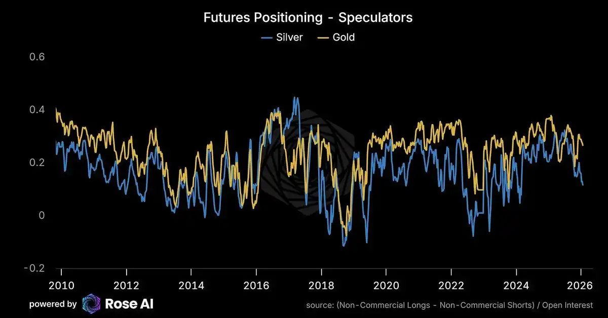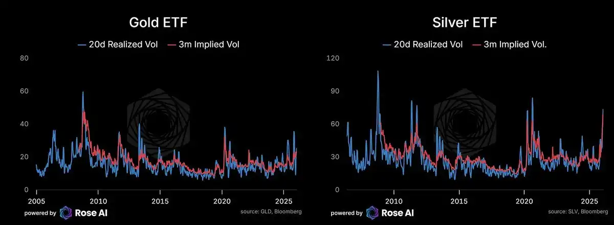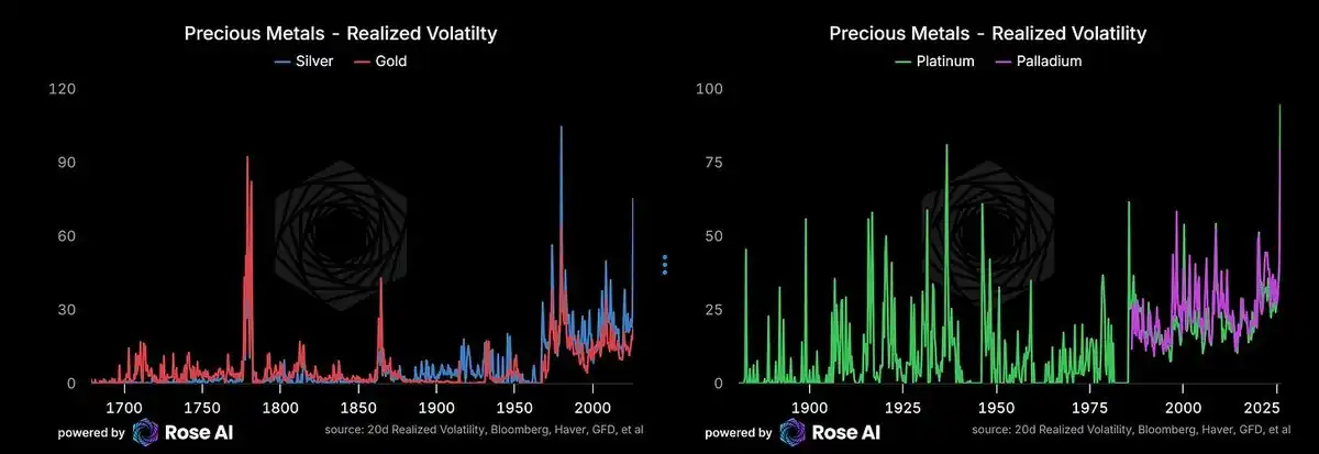 期权市场正在定价未来数月日波动率超过 4%,且在可预见的未来将保持 3% 的波动。这已被已实现波动率所印证。在有记录的历史中,白银波动率更高的时期仅有两次:1981 年亨特兄弟操纵逼空时期,以及美国独立战争时期(当时波动源于当地货币对英镑崩溃,而非金属本身价格变动)。