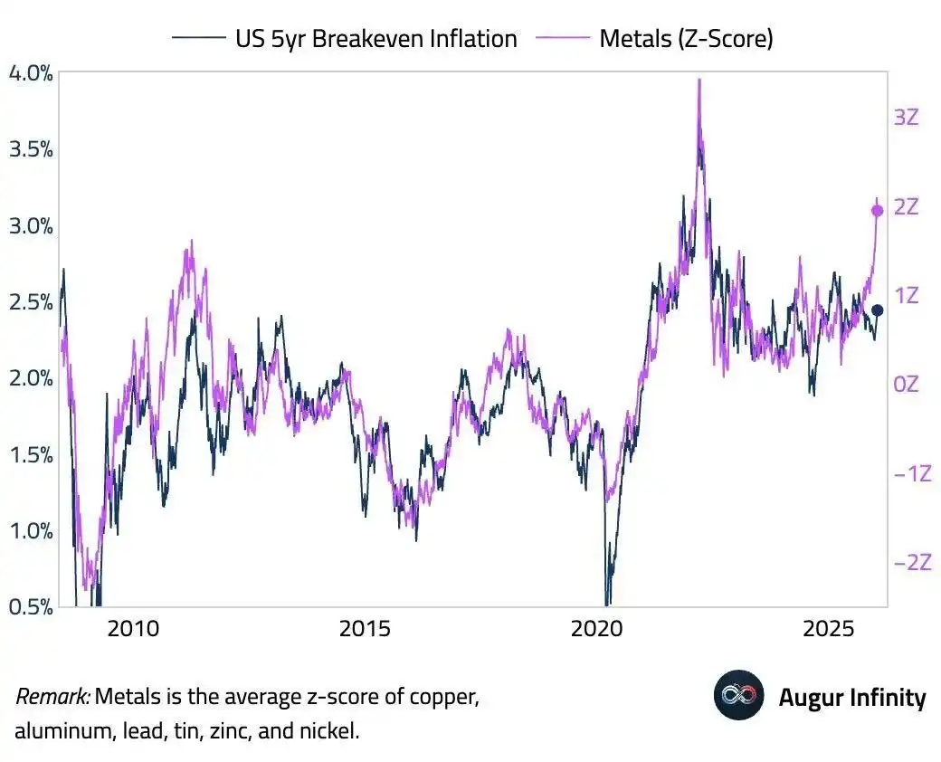 美元走强 + 高价格 = 弱势持仓者恐慌出逃。那些在 100 美元上方追高的投机者,不同于从 30 美元就开始积累的中国家庭。弱势持仓者会在剧烈反转时认赔出局。如果下图正确,我们正看到金属价格与盈亏平衡通胀率之间脱节达到极端水平。这可能通过利率/美元走高和金属价格下跌来重新对齐。
