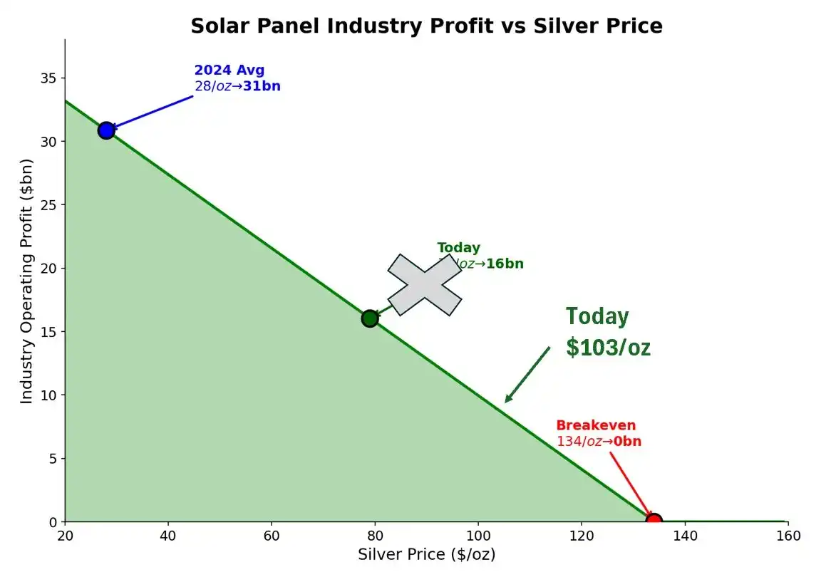 在 28 美元/盎司(2024 年均价)时,该行业利润为 310 亿美元。在今天的 103 美元下,利润可能缩水至 80-100 亿美元。盈亏平衡点在 134 美元/盎司——距离当前价仅 30%。在年化波动 70% 的市场中,这不是一个舒适的缓冲垫。