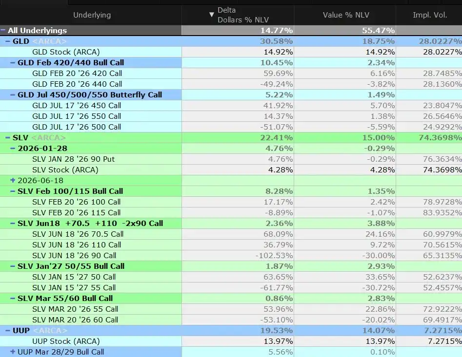 我们开始看到这些相同的动态蔓延至其他金属。特别是铜,正受到那些错过白银行情、正在做粗略估算的投资者的大量关注。局面虽不如白银戏剧性——铜不具备同样的货币/凡勃伦特性——但 AI 电力需求的故事是真实的,供给约束也类似。我们也做多铜。稍后再详谈。