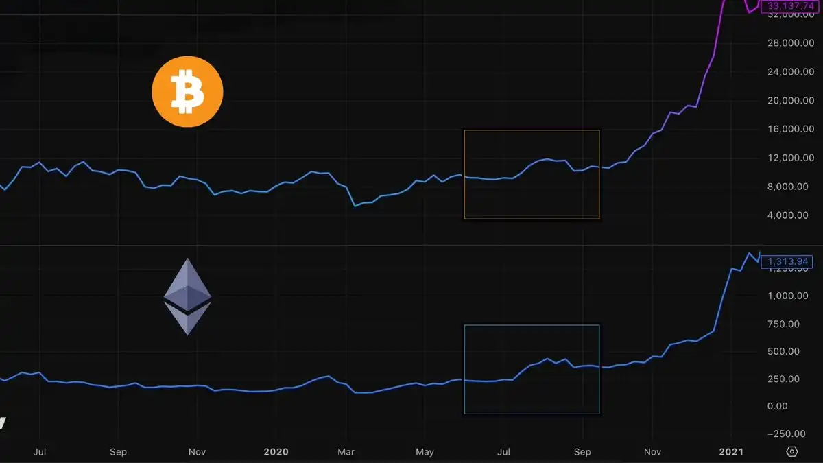ICO 狂潮时期(2017 年中 - 2018 年中)的 BTC 与 ETH 价格