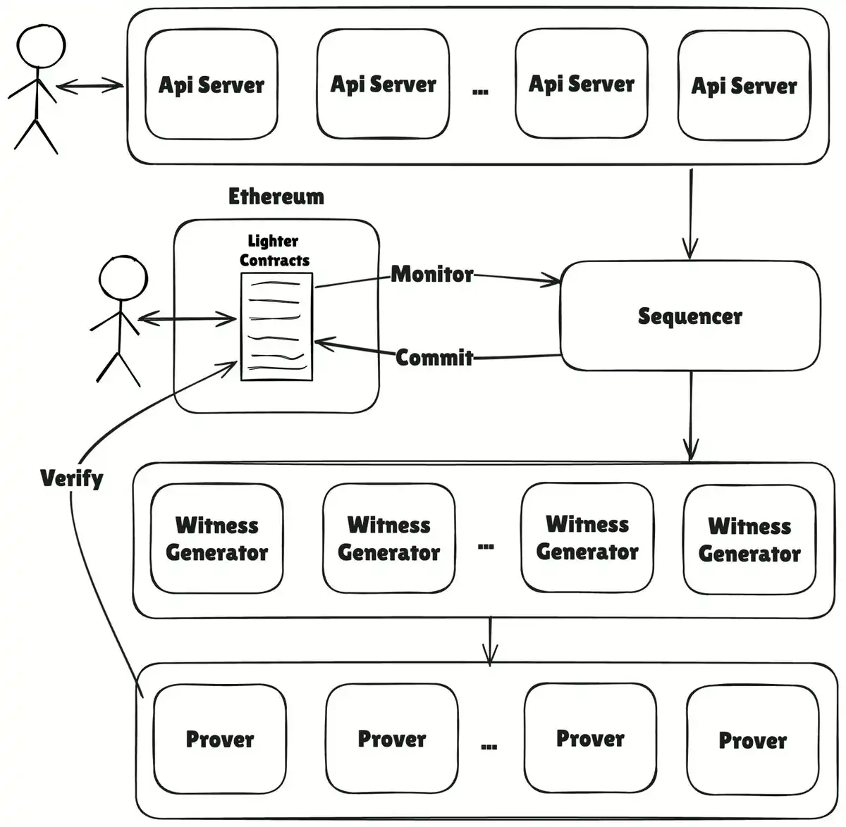 Lighter 使用定制的 ZK 电路为所有操作(包括订单匹配和清算)生成密码学证明,最终结算发生在以太坊区块链上。这种方法使平台能够以毫秒级延迟处理每秒数万笔订单,同时确保每一笔交易都可证明是公平的且可在链上验证。