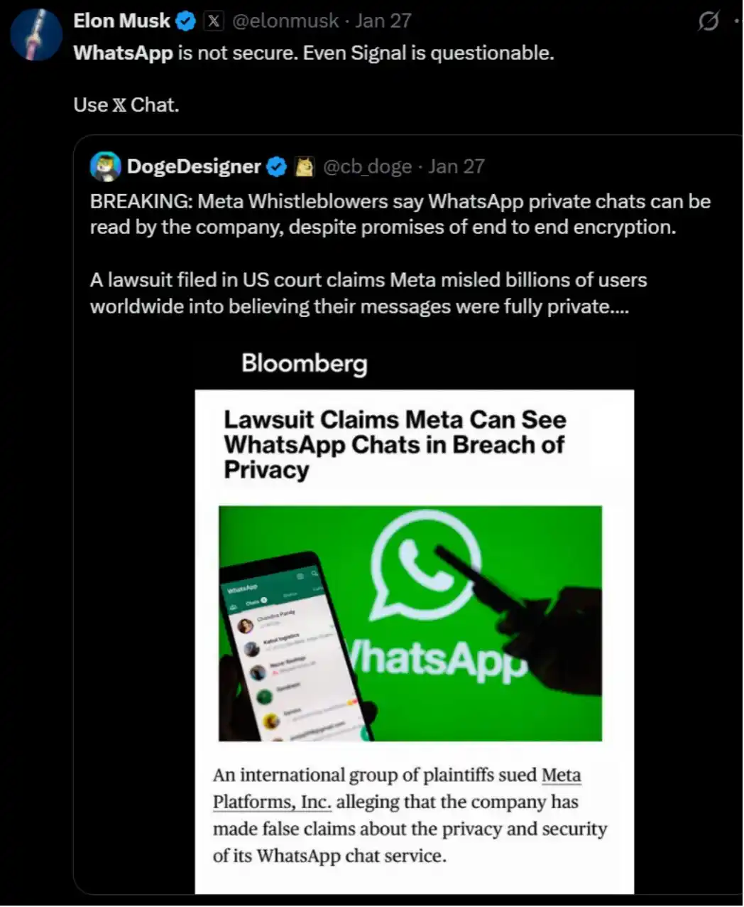 当前主流的中心化 AI(如 OpenAI、Google、Meta)普遍面临 不透明、黑箱模型以及审查风险 等问题。埃隆·马斯克近期对 Meta 获取 WhatsApp 数据的公开批评,正是这一结构性隐忧的一个缩影。