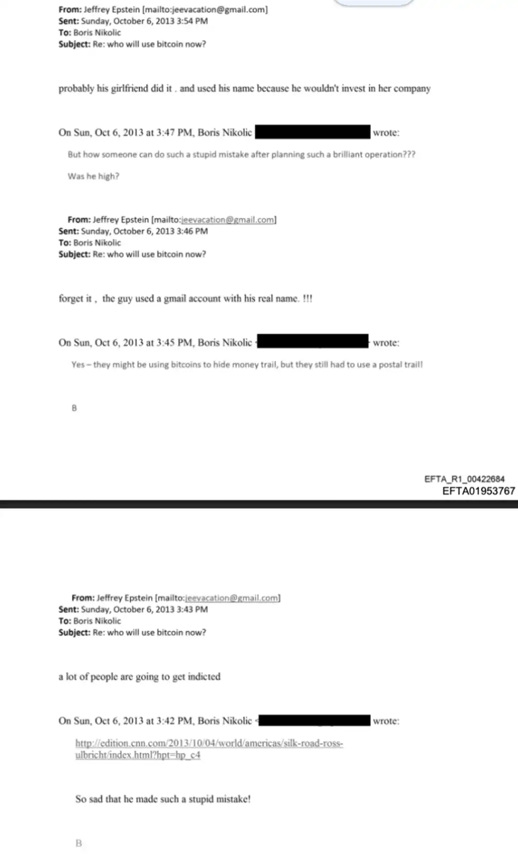 首先是 Boris Nikolic(此人曾担任比尔·盖茨的首席科技顾问,并被列入爱泼斯坦遗嘱中)的往来邮件,标题为「现在谁还会用比特币?」。他们戏谑而嘲讽地讨论了当年被捕的 Silk Road 创始人 Ross Ulbricht,说 Ross 使用了一个带有自己真实姓名的 Gmail 账号是一个愚蠢的错误。