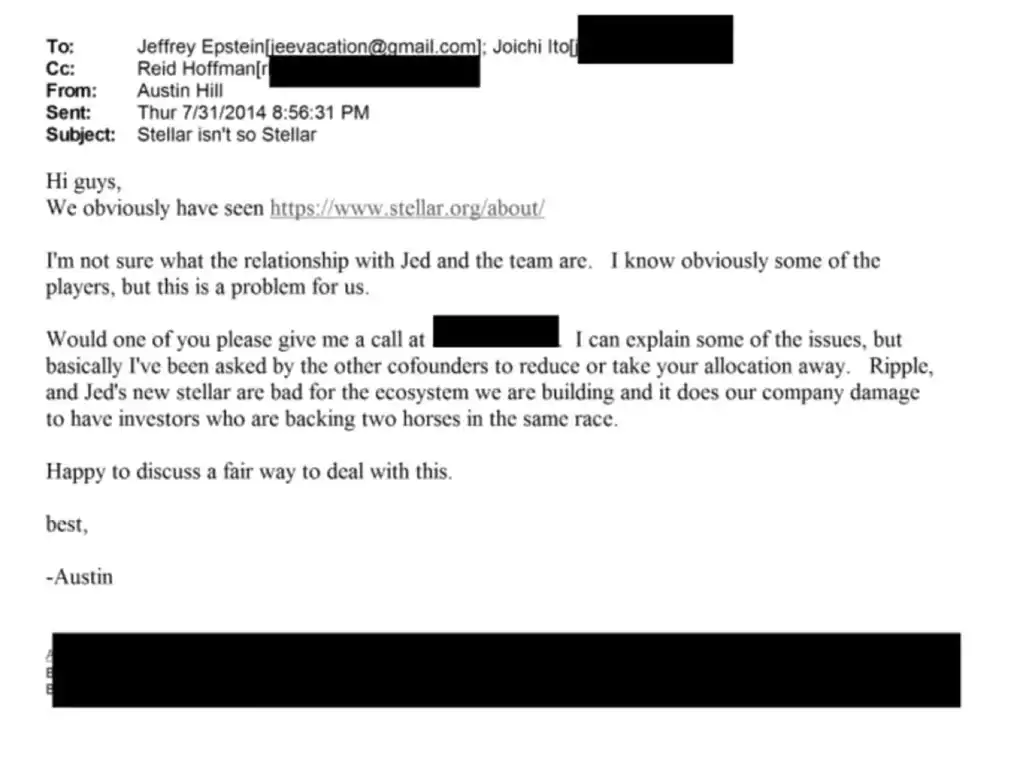 此外,Austin Hill 还在 2014 年向爱泼斯坦和伊藤穰一(Joi Ito,麻省理工学院媒体实验室前主任,爱泼斯坦通过他的基金对 Blockstream 进行投资)发邮件,他表示,Ripple($XRP) 和 Stellar(Ripple 创始人 Jed McCaleb 离开 Ripple 后的新项目)对 Blockstream 所建造的生态起到了负面影响,并且对 Blockstream 造成了伤害,因为他们的投资人在「同时支持一个跑马比赛中的两匹马」。