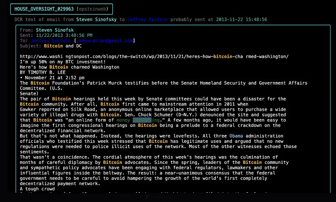a16z 董事会合伙人,曾任微软 Windows 部门总裁的 Steven Sinofsky 在邮件中向爱泼斯坦表示,他的比特币投资已经上涨了 50%,并分享了 Timothy B. Lee 的文章「比特币如何迷住华盛顿」。