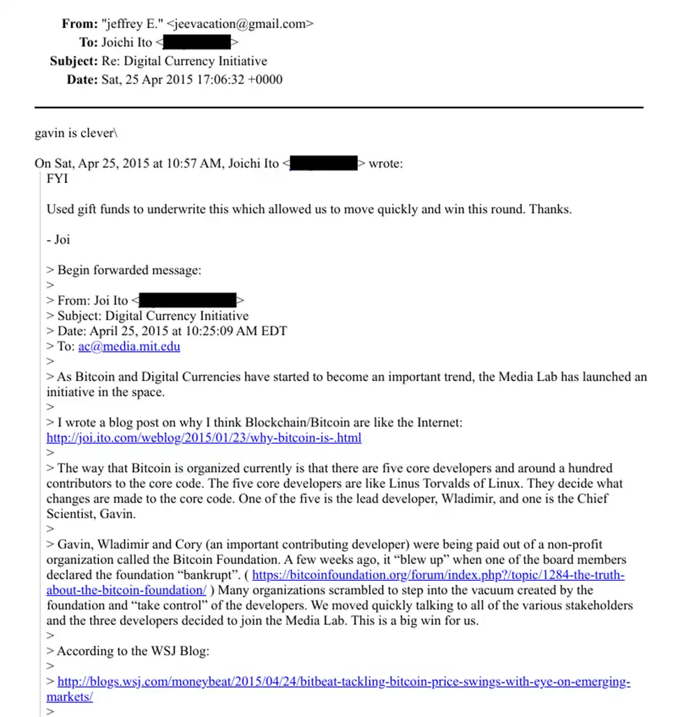 当时,丑闻还未曝光,公众也不知情爱泼斯坦向麻省理工学院媒体实验室的匿名捐赠。伊藤穰一通过邮件向爱泼斯坦表示感谢,不仅向爱泼斯坦解释了 Bitcoin 的开发运作情况,还表示多亏有这笔钱让实验室「能够快速行动并取得巨大胜利」,因为「很多组织都想趁虚而入控制比特币的开发者」。