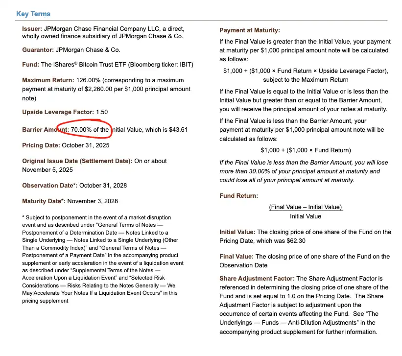 以摩根大通去年 11 月定价的一只票据为例,可以看到其敲入障碍位正好设在 43.6。如果这些票据在 12 月继续发行,而比特币价格又下跌了 10%,那么可以想象,在 38–39 区间将堆积大量敲入障碍,这正是所谓的「风暴眼」。