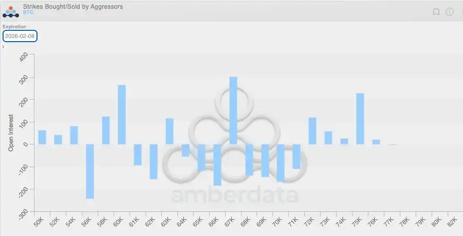 将这一负 Vanna 动态与另一个事实结合起来看,逻辑会更加清晰。由于此前一段时间整体波动率偏低,加密原生市场的客户在过去几周中普遍倾向于买入看跌期权。这意味着,加密交易商本身就处于天然的空 Gamma 状态,而且在定价上低估了未来可能出现的超幅波动。当真正的大幅行情出现时,这种结构性失衡进一步放大了下行压力。下方的仓位分布图也清楚地显示了这一点,在 6.4 万至 7.1 万美元区间,交易商主要集中在看跌期权的空 Gamma 头寸上。