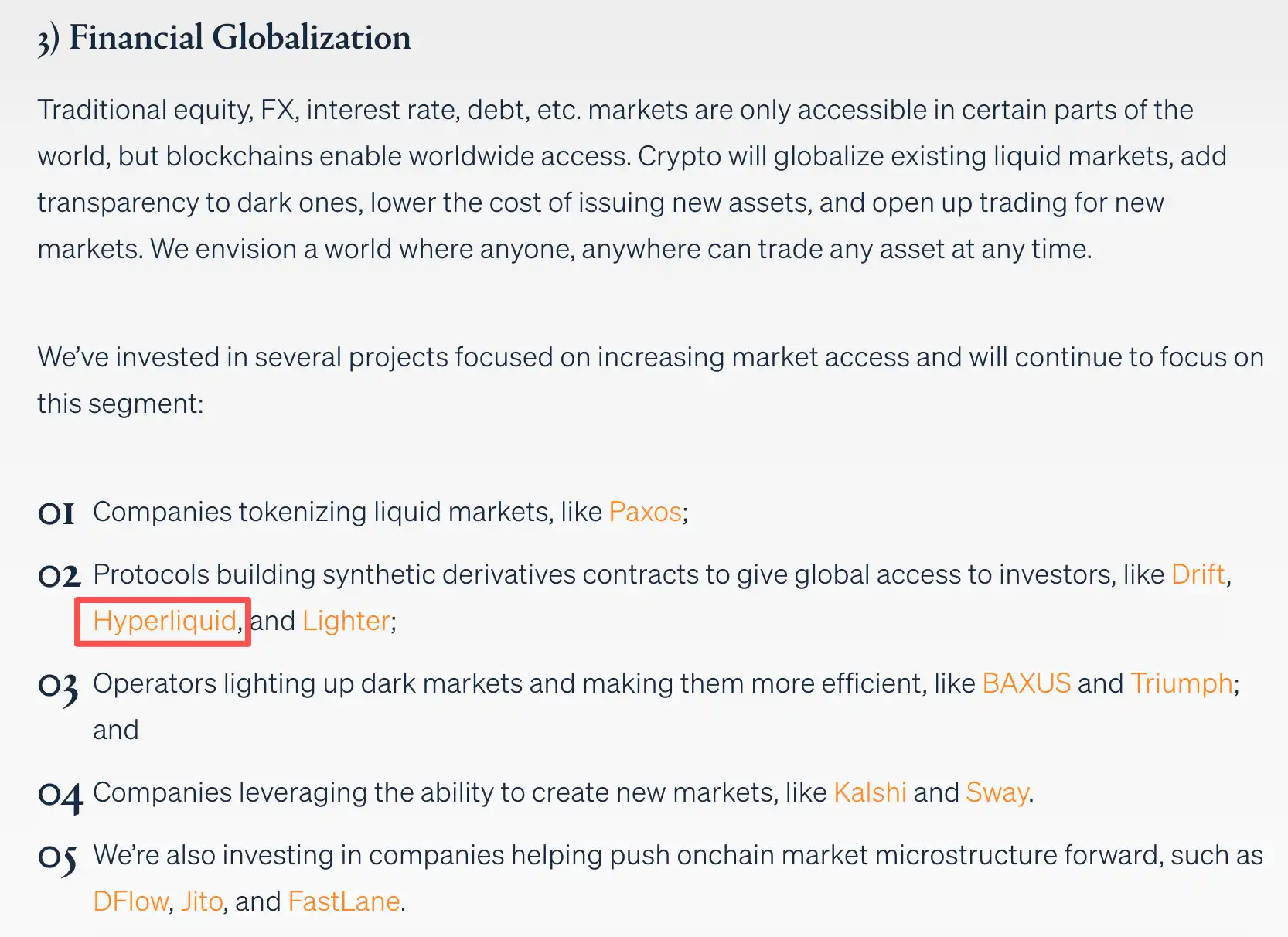 Crypto Banter 创始人 Ran Neuner 则发现,在 Multicoin Capital 另一位联合创始人 Tushar Jain 上周末公布的未来五年投资主线中,Hyperliquid 作为第三条主线「金融全球化」的代表项目赫然在列,而 Kyle Samani 长期以来极度看好的 DePIN 却完全未被提及。