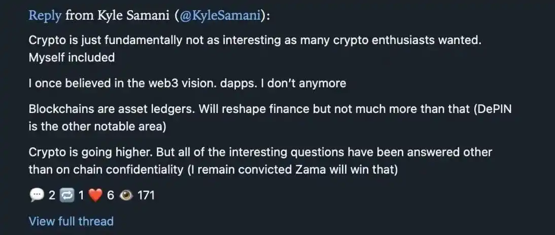 首先是在退圈当日,Kyle Samani 在回复 Stix 创始人 Taran 时曾表示:「加密货币根本就不像很多人(包括我自己)曾经想象的那么有趣。我曾经相信 Web3 的愿景,相信 DApps,但现在我不信了。区块链本质上就是资产账本,它们会重塑金融,但也就仅此而已,不会再有太多影响。」