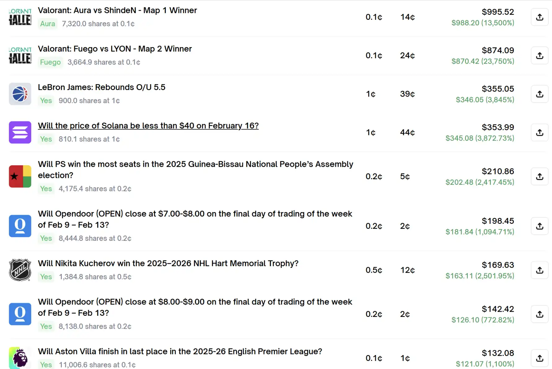 这是典型的「小仓位博大赔率」。在流动性极差、或者大众极度看衰某个选项的长尾市场(如电竞赛事的分局结果)中,它利用 Bot 监控那些被错误定价到近乎「归零」的选项。它并不需要预知谁会赢,它只需要知道 Fuego 赢的概率绝对不止 0.1%。这本质上是在收割市场的「极端情绪」和「流动性缺失」。