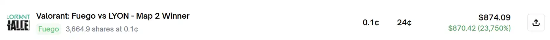 它以单价 0.1¢价格买入了 3,664.9 份的 Fuego 获胜,最终这笔交易回报高达 874.09 美元,回报率则达到恐怖的 23,750%!