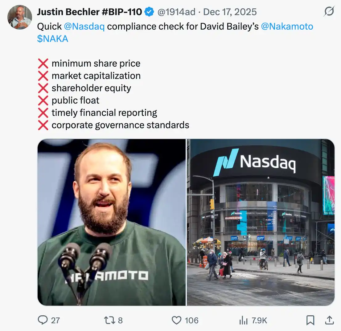 12 月 10 日,纳斯达克通知 Nakamoto,因股价连续 30 个工作日低于 1 美元,面临退市风险。公司必须在 2026 年 6 月 8 日之前重新合规,即连续 10 个交易日收盘价高于 1 美元。