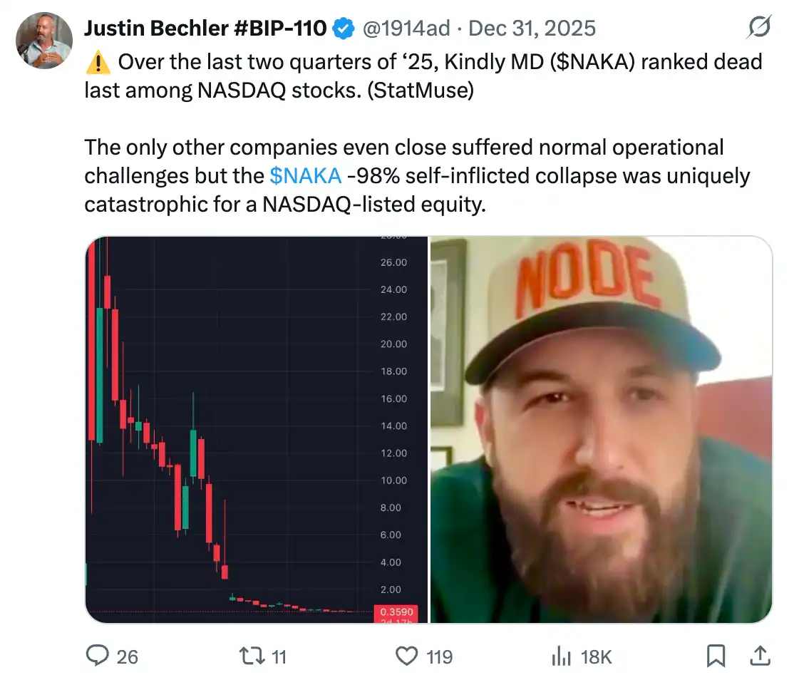 贝利创建了 Nakamoto Holdings。通过 KindlyMD 将其并入一个上市壳公司,在此过程中筹集了 7.1 亿美元。在散户的热情推动下,股价被炒到 NAV 的 23 倍。PIPE 投资者以 1.12 美元入场,而公众支付的价格是这个数字的 20 到 30 倍。股价随后暴跌 99%。