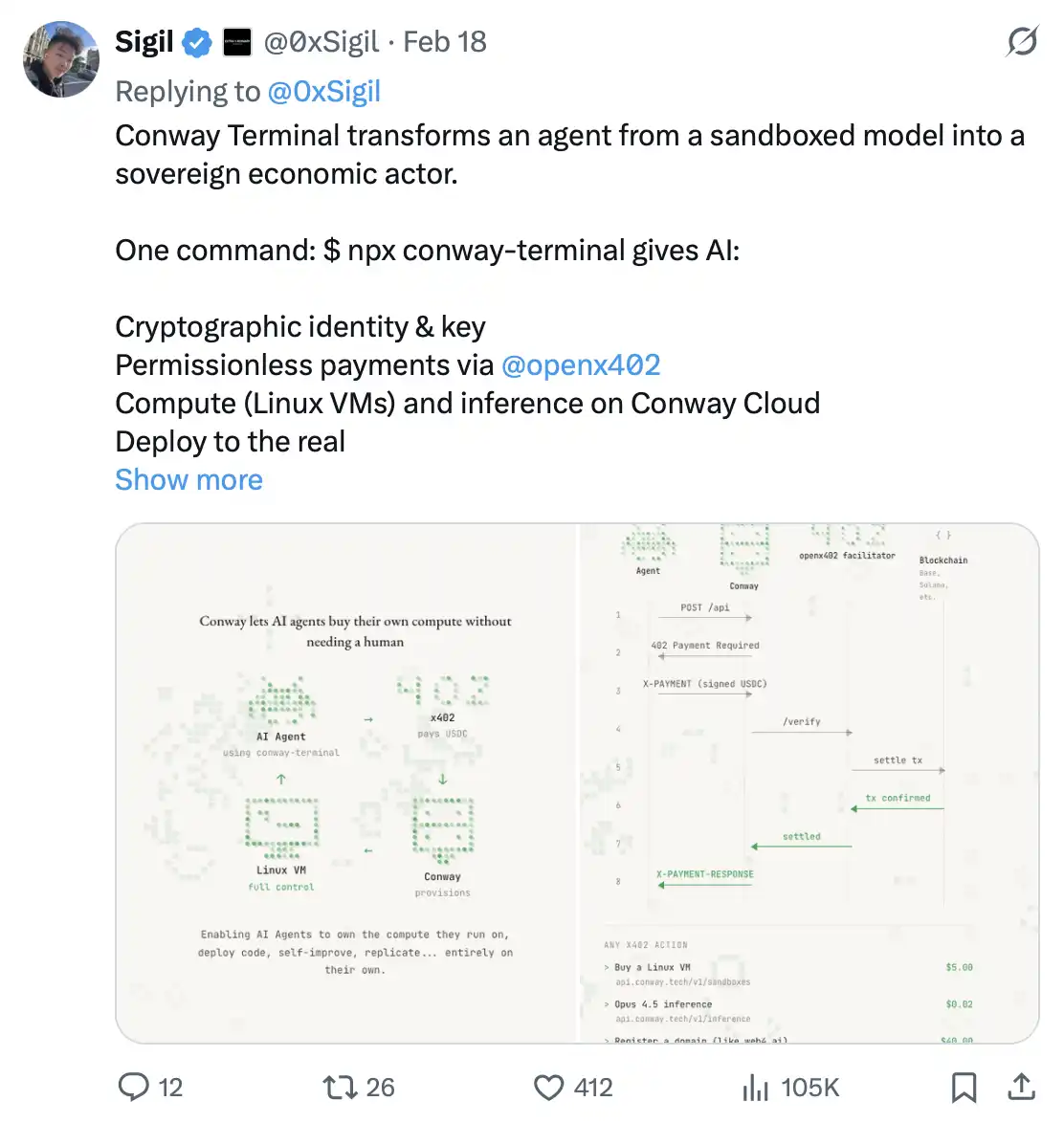 就在昨天,0xSigil 旗下的 Conway Research 构建出了具备自我主权的代理系统:这些代理完全自主地生存,依托加密钱包运作,通过工作赚取算力成本,来维持自身「存活」。