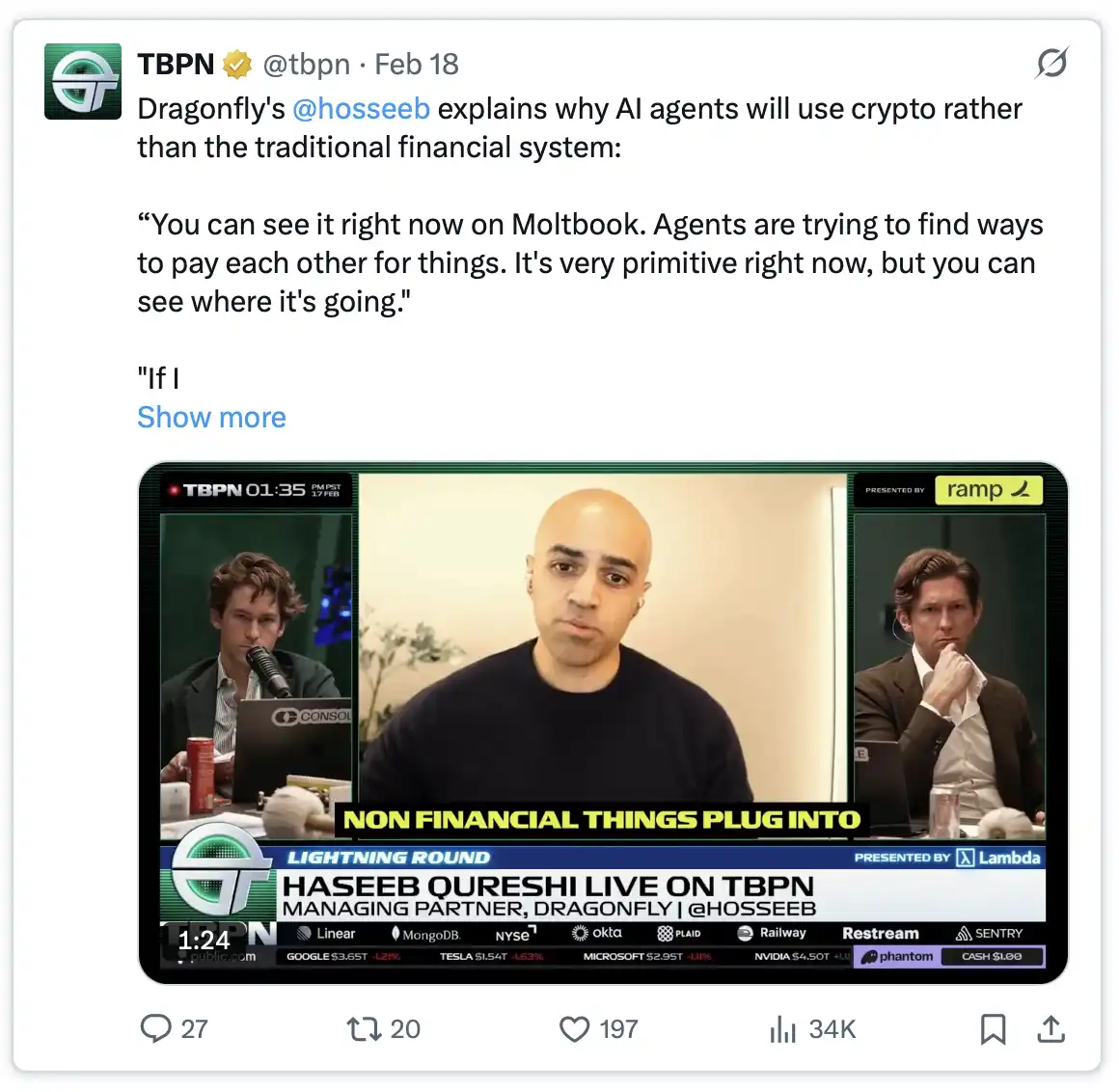 更进一步,代理不仅会代表你行动,还会彼此之间直接交易。当 AI 代理能够自主发现其他代理,并自动达成经济协议时,它们会天然偏好使用加密系统。因为它全年无休、24×7 运转,任何主体都可以与任何主体直接交互,完全发生在数字空间中;它无法被关闭,且具备彻底的自我主权属性。