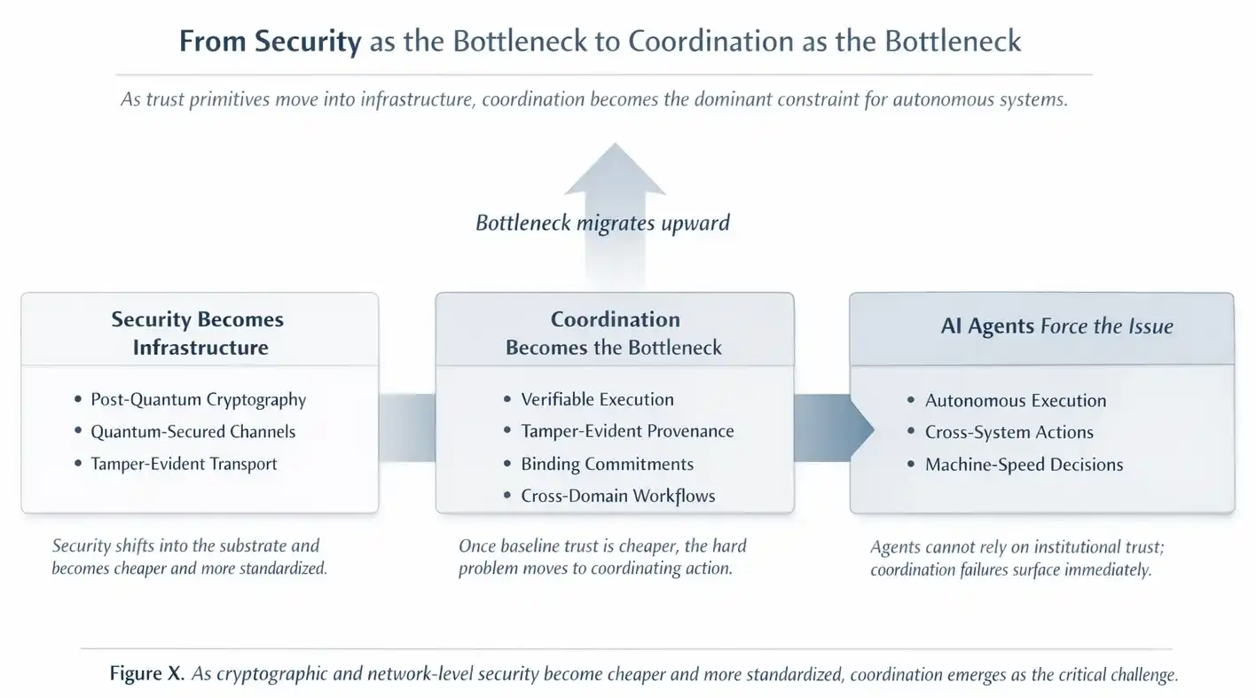 即便这些升级并不普遍,它们也会开始塑造系统的构建方式:团队会假设网络层与密码层的基线更强,把更多注意力转向系统之间如何交互、如何协调行动、以及如何在不互信的参与方之间执行规则。