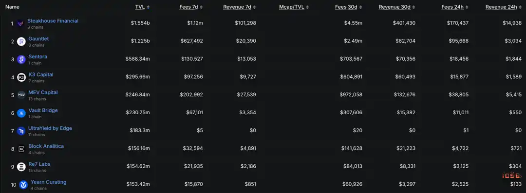 AUM 高度集中,头部的 Steakhouse Financial ≈ $1.55B,Gauntlet ≈ $1.23B,前两名合计接近 50% 市场份额,是一个非常典型的幂律结构。