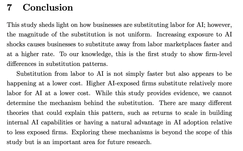 确有证据支持了 Citrini 的观点。Bick、Blandin 与 Deming 的一项基于企业支出数据的实证研究显示,在 ChatGPT 发布后,AI 暴露程度最高的企业(即此前在在线劳动力市场上支出占比最大的企业)显著增加了对 AI 模型提供商的支出,同时减少了在在线劳动力市场上的支出,降幅达到约 15%。值得注意的是,这种替代并非"等额置换"——企业每减少 1 美元的劳动力市场支出,仅增加了 0.03 至 0.30 美元的 AI 支出。换言之,AI 正在以远低于人工的成本完成同等工作量。
