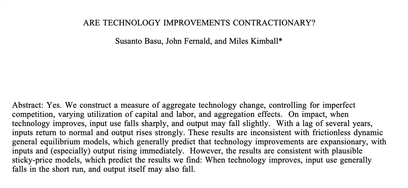 还有反驳者引用 Kimball、Basu 与 Fernald 1998 年的研究指出,技术冲击在历史上往往是对供给侧的正向刺激——短期内可能伴随就业结构的调整,但长期来看,它创造的产出空间远大于它摧毁的岗位。
