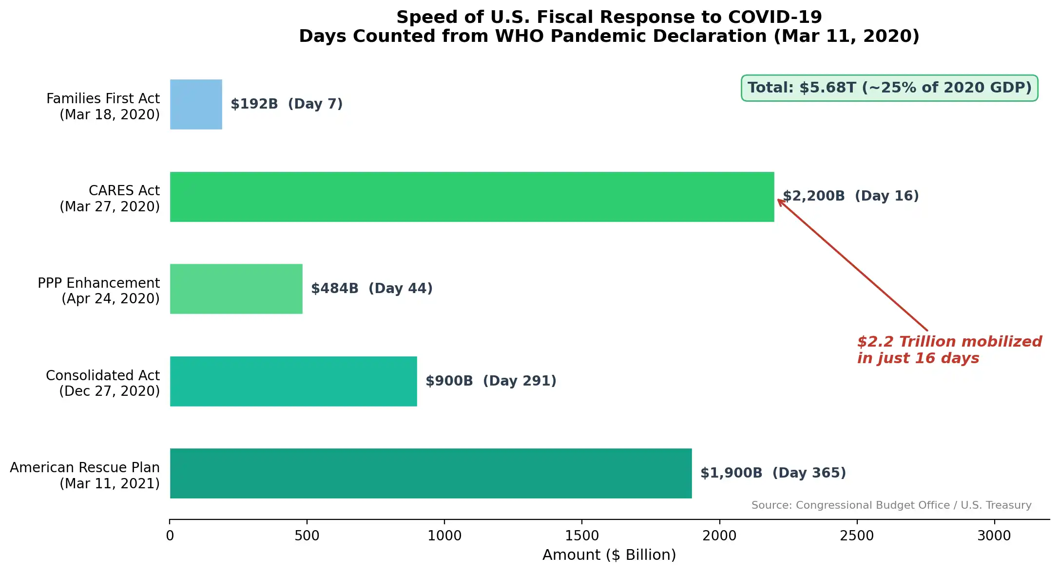 制度的反应能力似乎也被低估了,以 COVID 时期的政策响应为例,2020 年 3 月 11 日 WHO 宣布疫情大流行,仅仅 16 天后,规模达 2.2 万亿美元的 CARES Act 便已签署生效。在此后一年内,美国累计推出 5.68 万亿美元的财政刺激,相当于 2020 年 GDP 的约 25%。