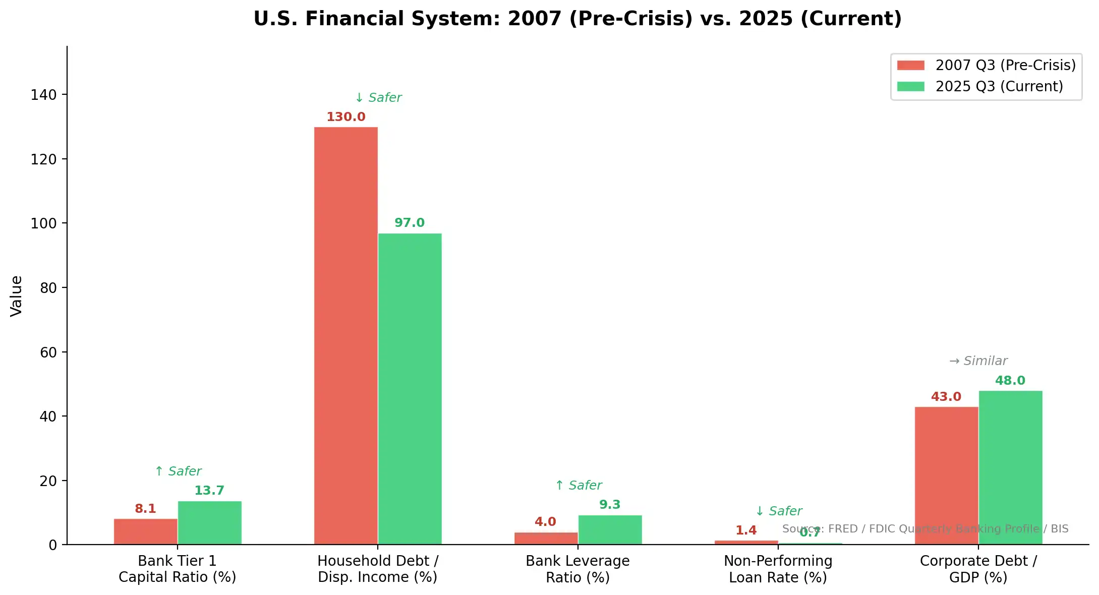然而评论者指出,与 2008 年相比,当前美国企业部门的杠杆率远为健康,银行体系在经历了 Dodd-Frank 改革和多轮压力测试之后也远比彼时坚固。