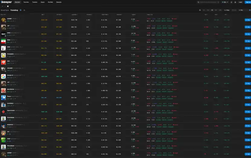 1Keeper Discover 页面:Trending 代币列表,覆盖市值、流动性、持有人等核心维度