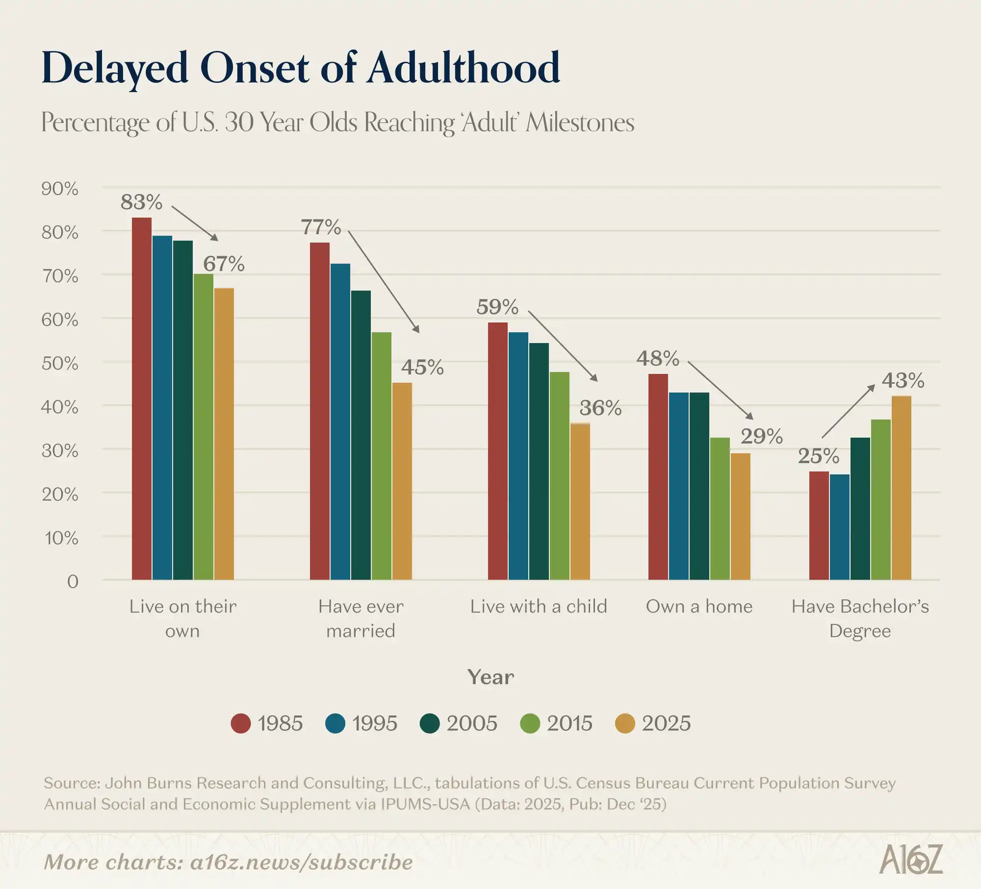 30 岁人群实现主要人生里程碑的比例,至少从 1980 年代起就一直在相当陡峭地下滑。