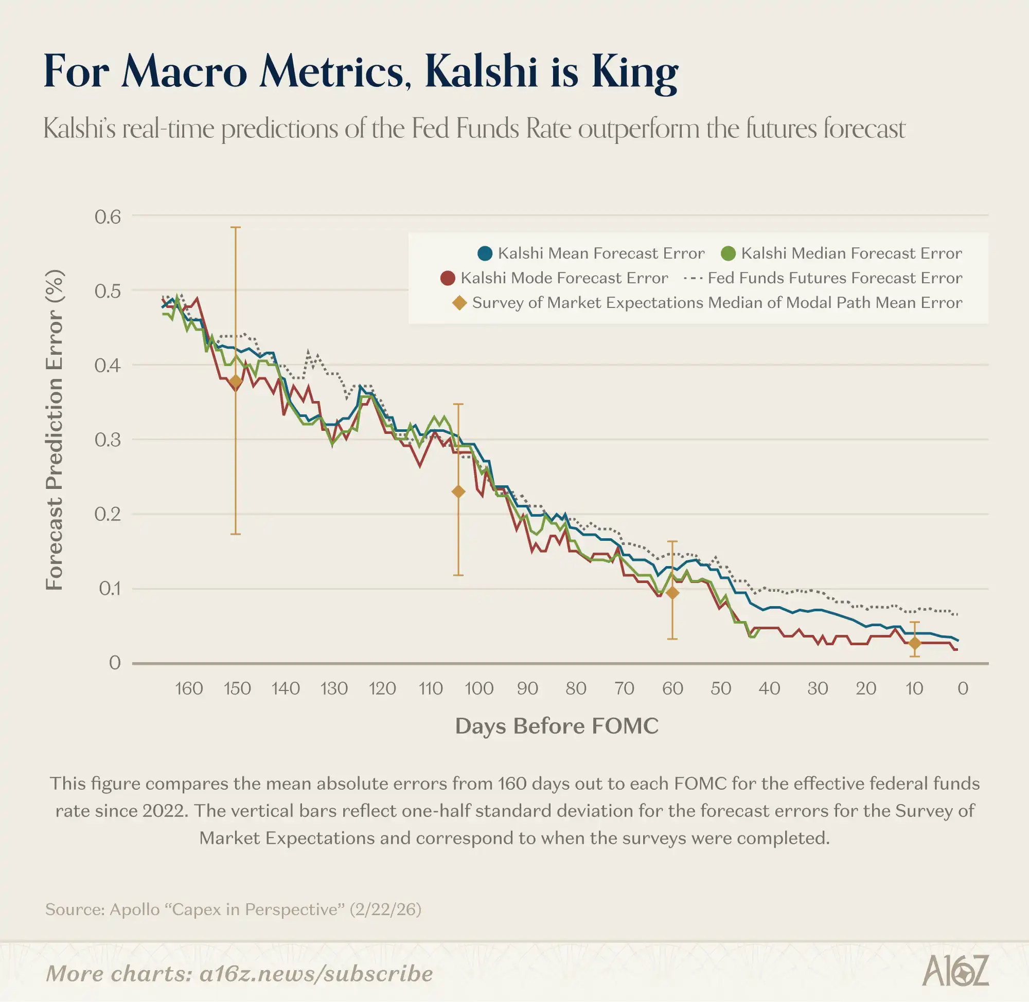 对于 150 天后(即 3 次 FOMC 会议后)的联邦基金利率预测,Kalshi 的平均绝对误差与专业预测机构非常接近。但与每六周才提供一次模态路径快照的调查不同,Kalshi 提供持续更新的完整概率分布……我们发现,Kalshi 的中位数和众数预测在 FOMC 会议前一天的预测记录完美无误,这相较于联邦基金期货预测在统计意义上是显著的改进。
