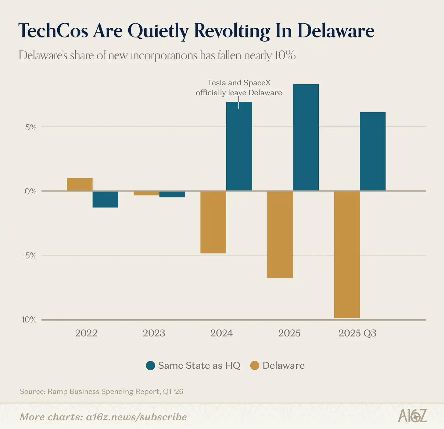 根据 Ramp 的数据,特拉华州在新公司注册中的份额自 2023 年起持续下滑,2025 年第三季度跌幅约 10%。