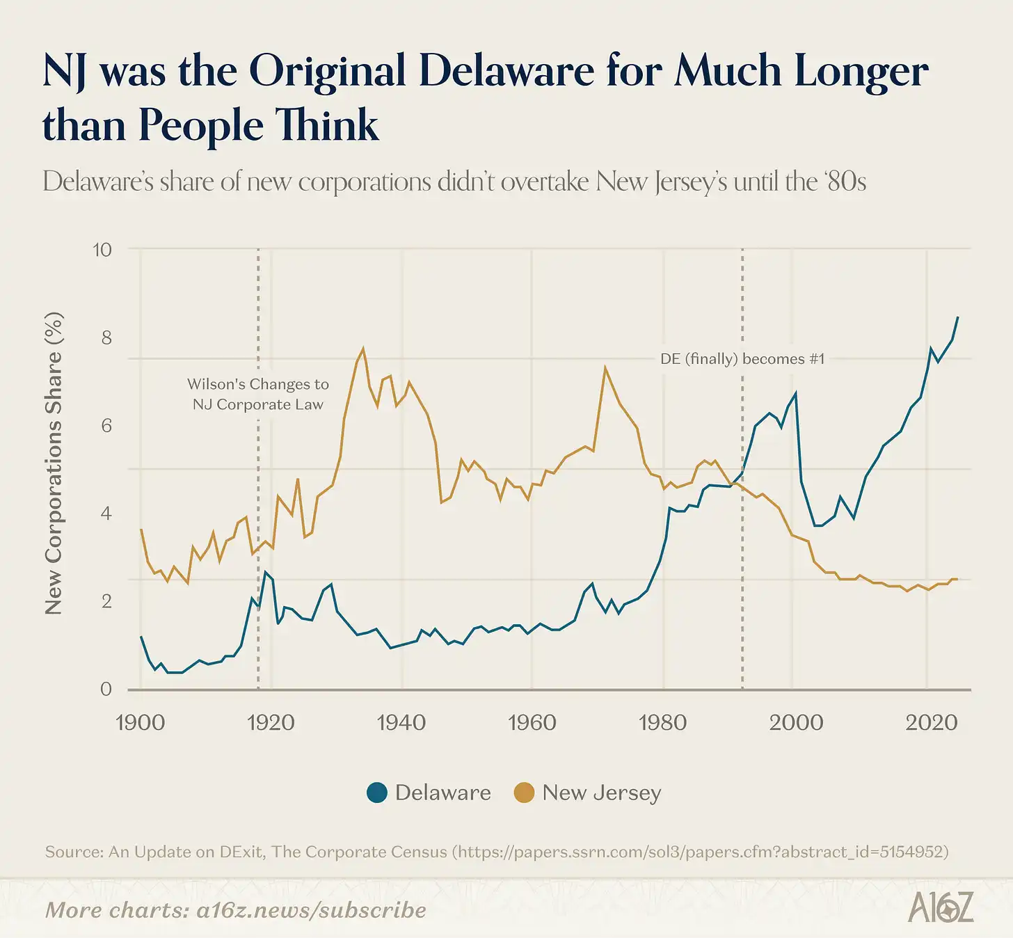 直到 1980 年代(也就是威尔逊州长执政约 60 年之后),特拉华才真正超越新泽西,成为美国企业注册数量第一的州: