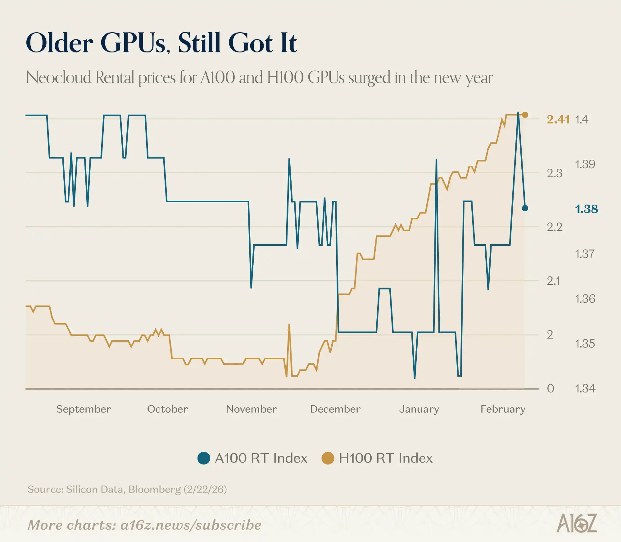 根据 Silicon Data 的数据,英伟达 H100 和 A100 的租用价格今年均在上涨。
