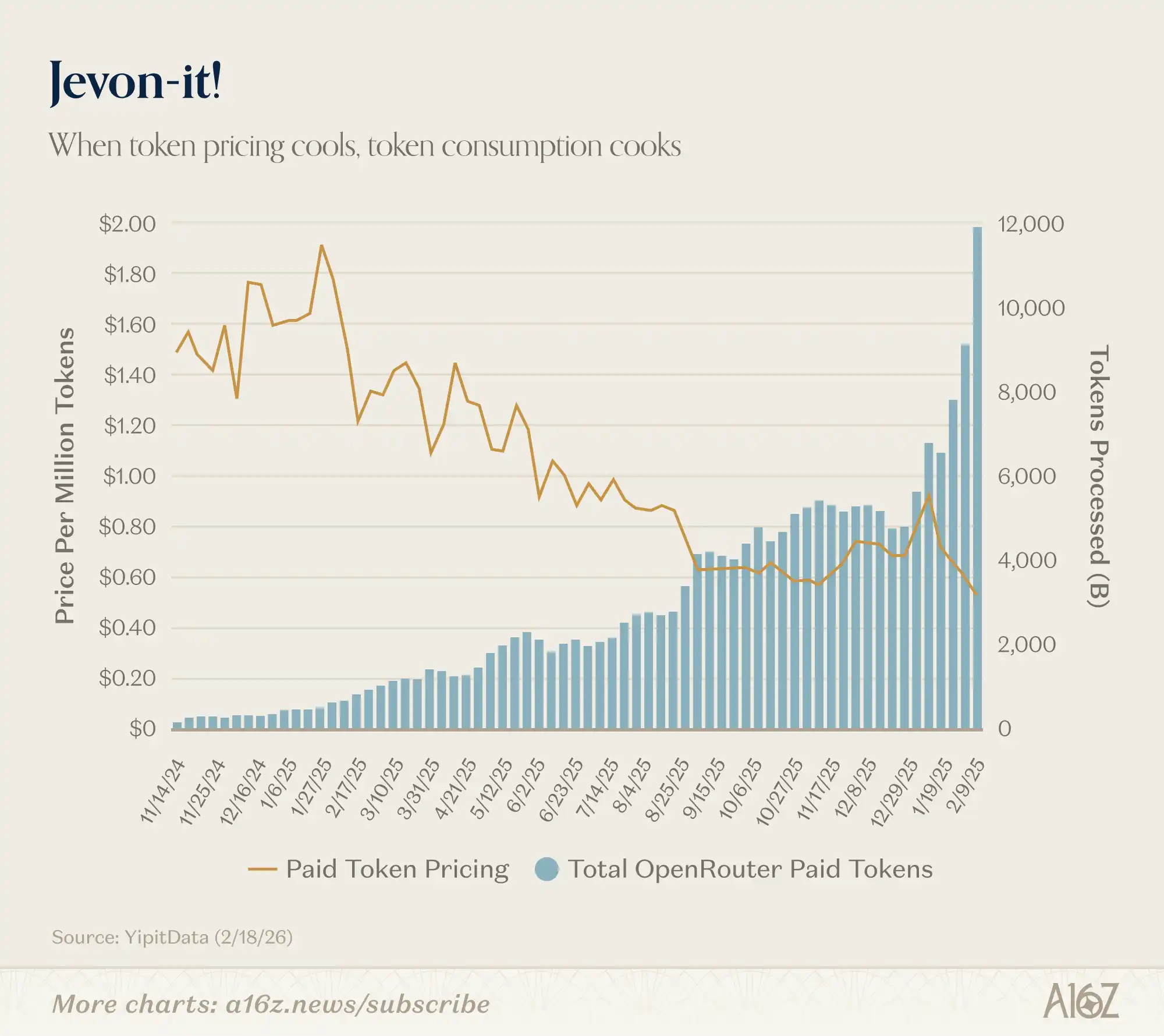 今年年初以来,付费 Token 定价从约每百万 Token 90 美分降至 50 美分,而处理的 Token 数量几乎翻倍,从约 6,000 增至 12,000。