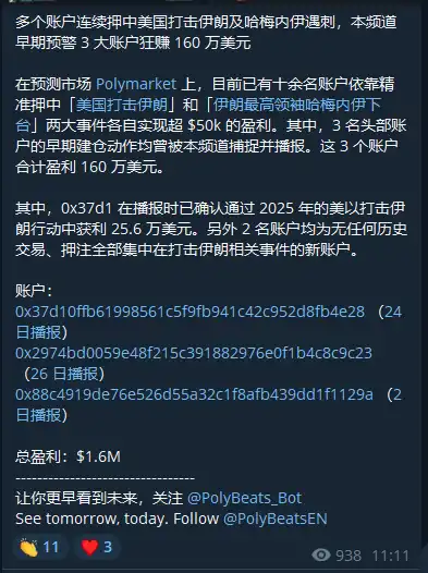 最终结果已众所周知:哈梅内伊在空袭中遇害。三个账户围绕伊朗打击相关事件累计获利约 160 万美元。监控频道 PolyBeats 对三人自 2 月以来的押注行为进行了持续跟踪播报,每一次建仓都发生在事件落地之前,将战事进程提前呈现在公众面前。