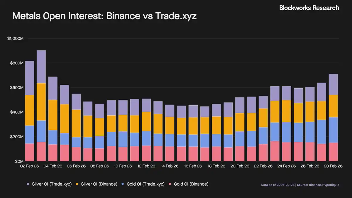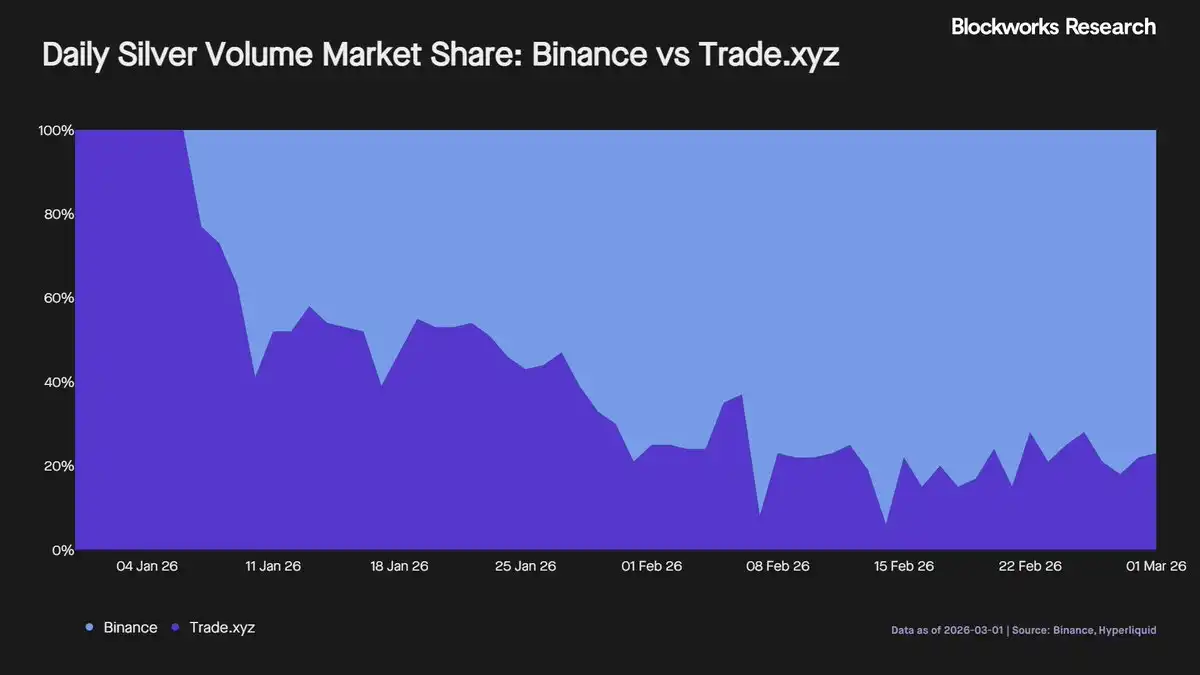 以美元绝对规模计,Binance 占主导地位。在黄金方面,Binance 相对于 Hyperliquid 的份额从低点的 54% 攀升至今天的 93%。
