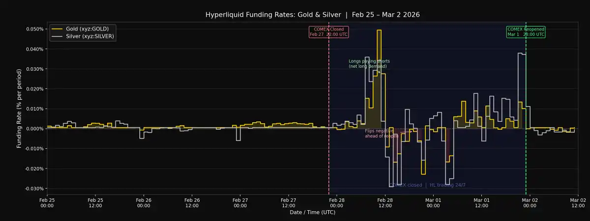 我以相同的一分钟 K 线对照 COMEX 第一个开盘价进行基准测试。COMEX 重开时,期货价格高于两个平台。Hyperliquid 在黄金方面比重开价格近了 22 个基点,在白银方面近了 31 个基点。换句话说,Hyperliquid 的周末定价被证明是对传统市场重开价格更准确的预判。